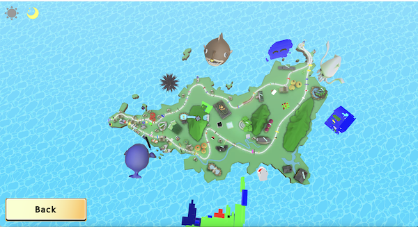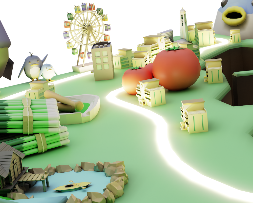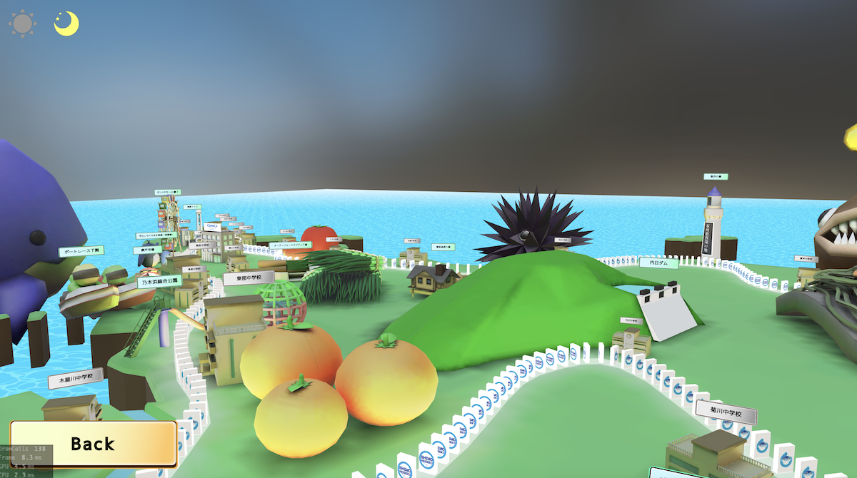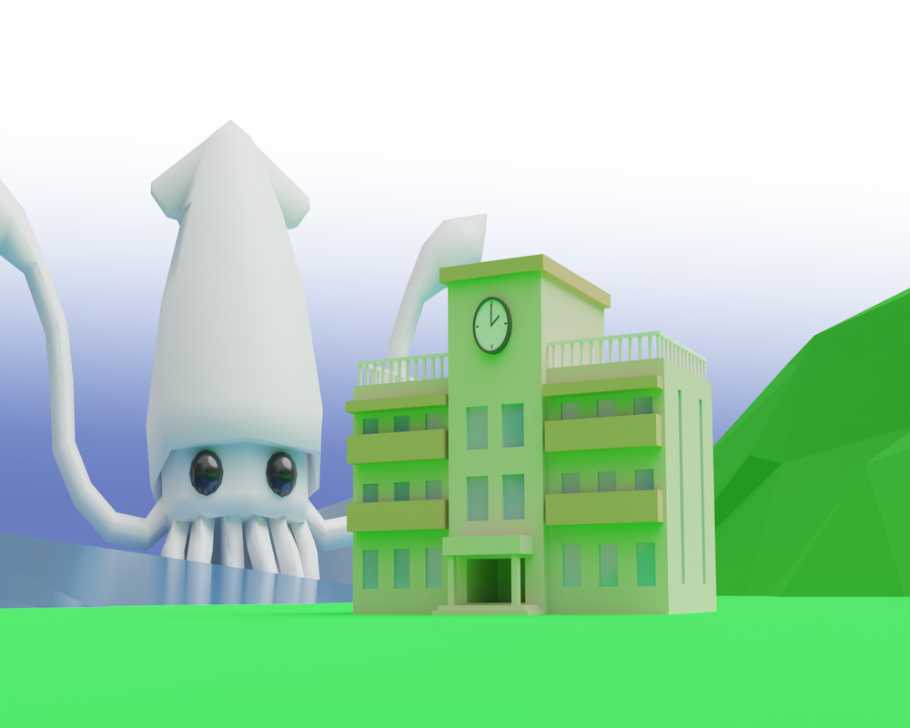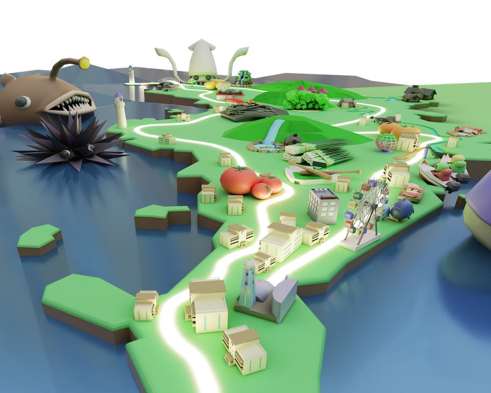 今回のプロジェクトでは、企画を担当していた下関拠点メンバーから、「下関市の全ての中学校から学生が参加するというイベントなので、全ての学校を入れ込んだフィールドを作りたい」という要望がありました。、それを踏まえて、下関市内の名産品や下関市の中学校をモチーフにした3Dデータを作成しました。